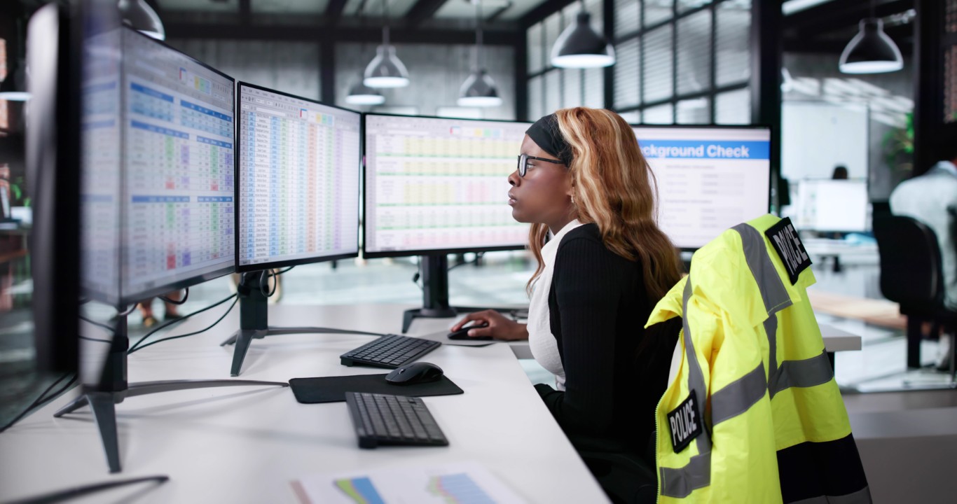 Police Woman Monitoring Screens In Call Center Office
